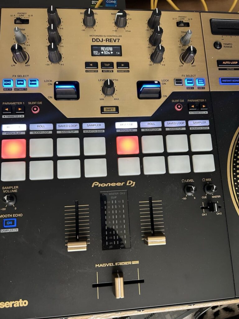 Verkaufe meinen Pioneer DJ DDJ-REV7 Limited Edition Gold Motorized DJ Controller für Serato Pro, Zustand wie neu und ohne Probleme